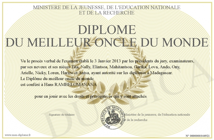Envoyez par email votre Diplôme du meilleur oncle du monde personalisé