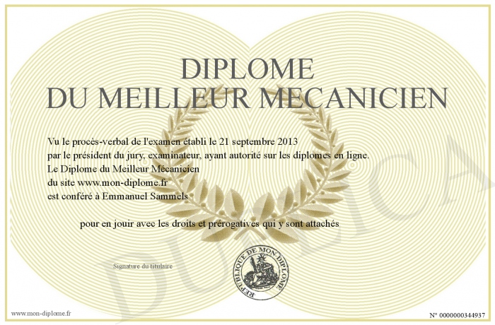 Envoyez par email votre Diplôme du Meilleur Mécanicien personalisé