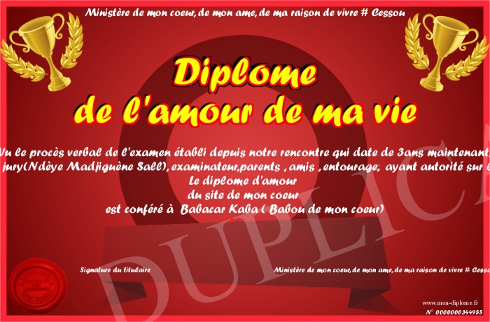 Envoyez par email votre Diplôme de l'amour de ma vie personalisé