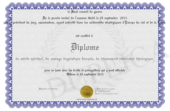 Envoyez par email votre Diplôme du mérite spirituel, du courage linguistique français, du dévouement intellectuel théologique personalisé
