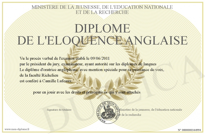 Envoyez par email votre Diplôme de l'éloquence anglaise personalisé