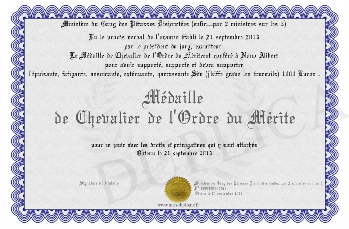 Envoyez par email votre Médaille de Chevalier de l'Ordre du Mérite personalisé