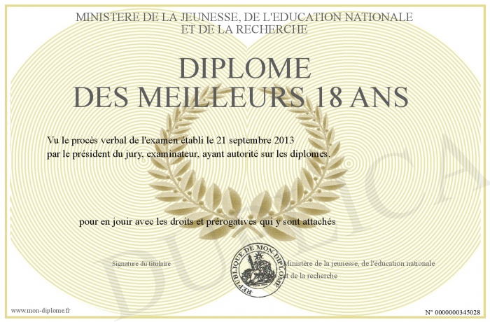 Envoyez par email votre Diplôme des meilleurs 18 ans personalisé