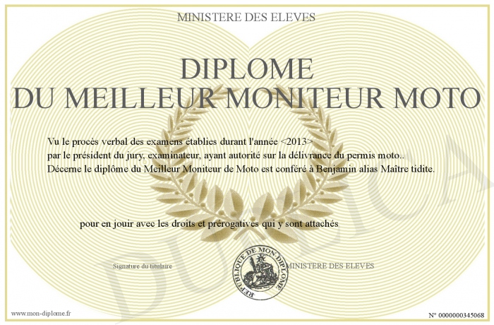 Envoyez par email votre Diplôme du Meilleur Moniteur MOTO personalisé