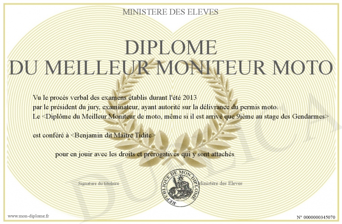 Envoyez par email votre Diplôme du Meilleur Moniteur Moto personalisé