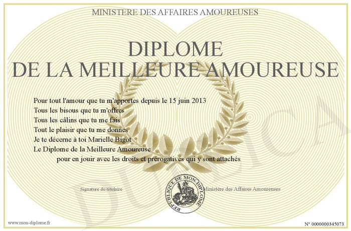 Envoyez par email votre Diplôme de la meilleure amoureuse personalisé