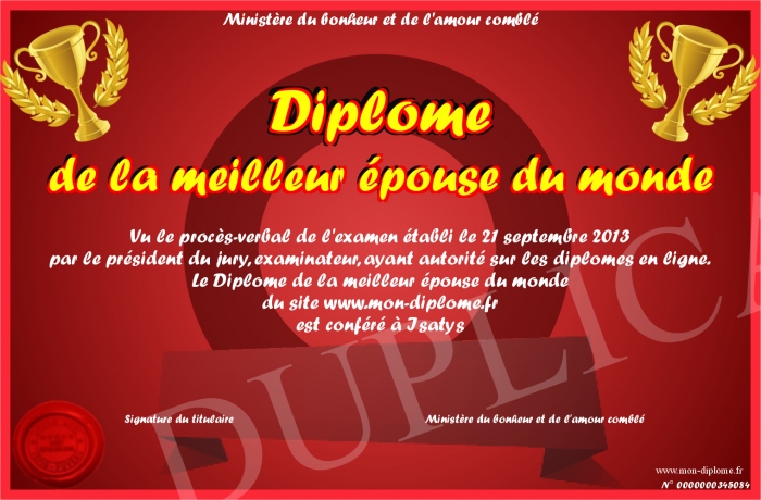 Envoyez par email votre Diplôme de la meilleur épouse du monde personalisé