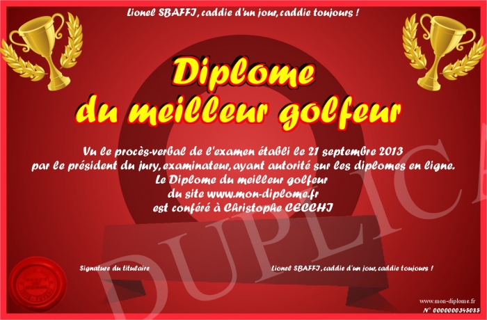 Envoyez par email votre Diplôme du meilleur golfeur personalisé