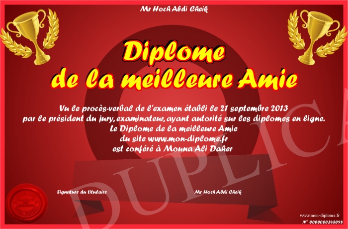 Envoyez par email votre Diplome de la meilleure Amie personalisé