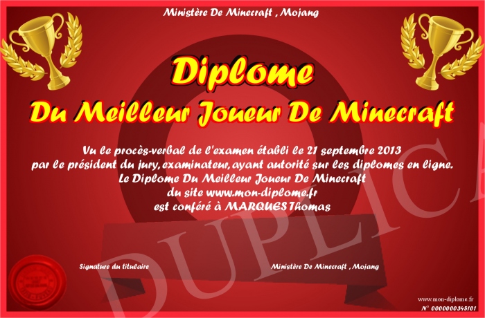 Envoyez par email votre Diplôme Du Meilleur Joueur De Minecraft personalisé