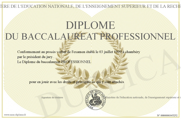 Envoyez par email votre Diplôme du baccalaureat PROFESSIONNEL personalisé