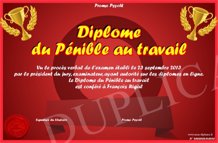 Envoyez par email votre Diplôme du Pénible au travail personalisé