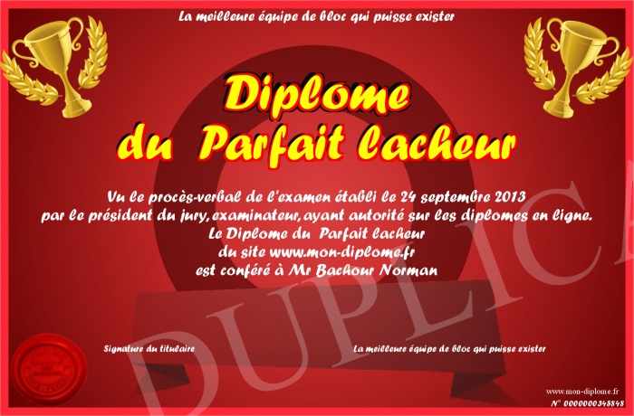 Envoyez par email votre Diplôme du Parfait lacheur personalisé