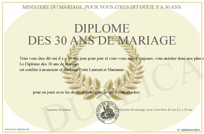 Envoyez par email votre Diplôme des 30 ans de mariage personalisé