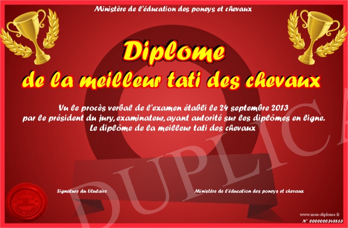 Envoyez par email votre Diplôme de la meilleur tati des chevaux personalisé