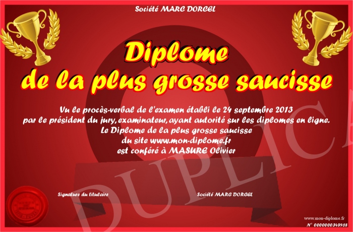 Envoyez par email votre Diplome de la plus grosse saucisse personalisé