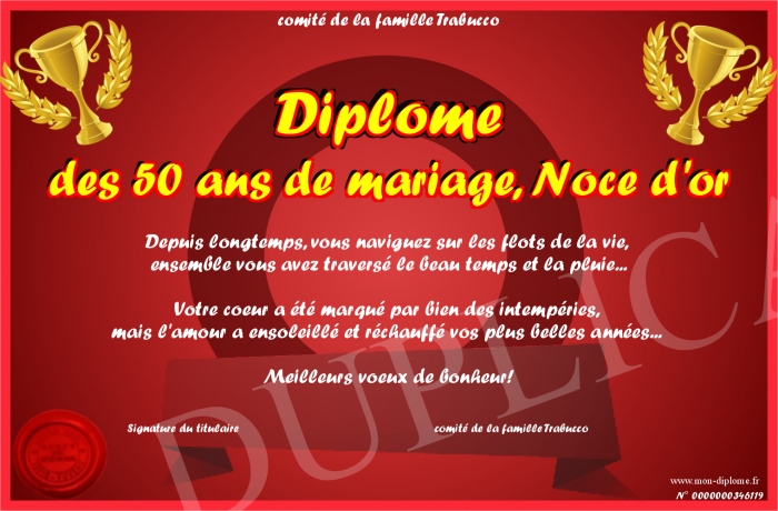 Envoyez par email votre Diplôme des 50 ans de mariage, Noce d'or personalisé