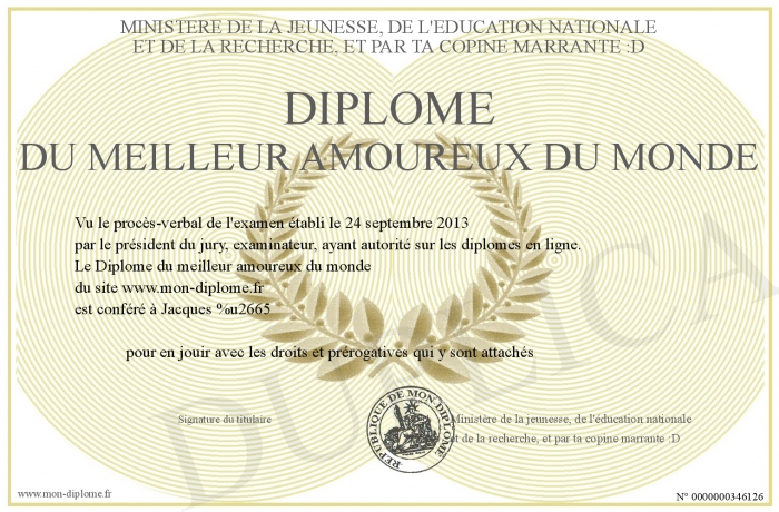 Envoyez par email votre Diplôme du meilleur amoureux du monde personalisé
