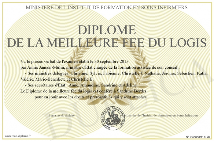 Envoyez par email votre Diplôme de la meilleure fée du logis personalisé