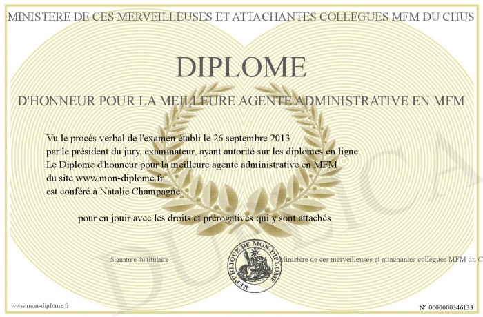 Envoyez par email votre Diplôme d'honneur pour la meilleure agente administrative en MFM personalisé