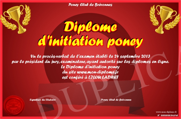 Envoyez par email votre Diplôme d'initiation poney personalisé