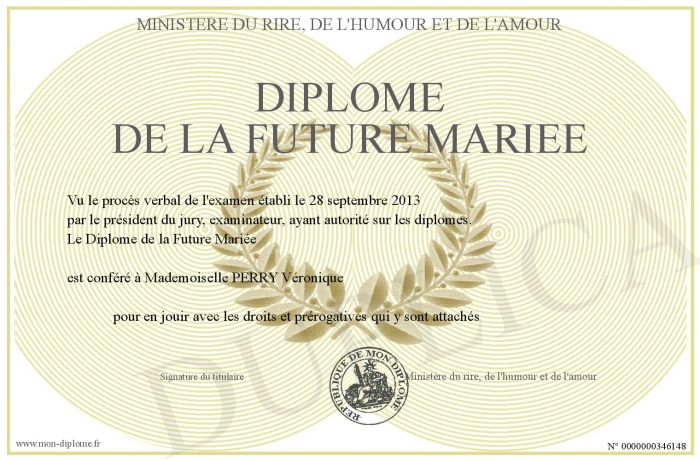 Envoyez par email votre Diplome de la Future Mariée personalisé