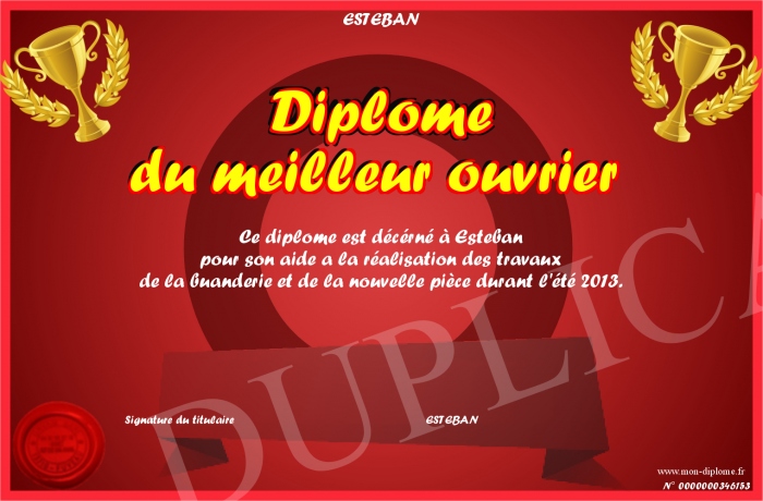 Envoyez par email votre Diplôme du meilleur ouvrier personalisé