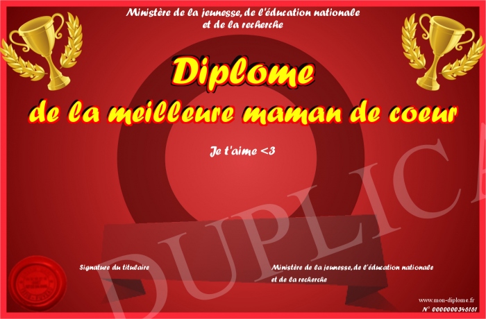 Envoyez par email votre Diplôme de la meilleure maman de coeur personalisé