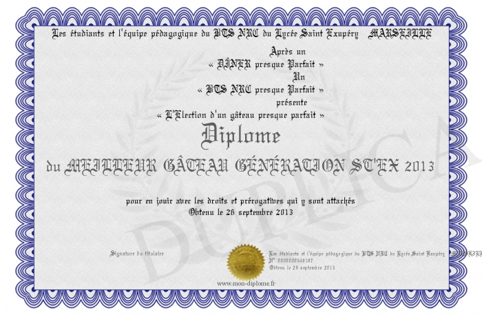 Envoyez par email votre Diplôme du MEILLEUR GÂTEAU GÉNÉRATION ST'EX 2013 personalisé