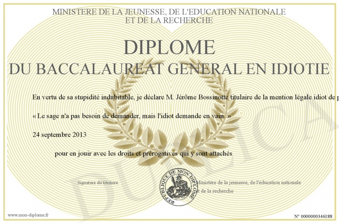 Envoyez par email votre Diplôme du baccalaureat général en idiotie personalisé