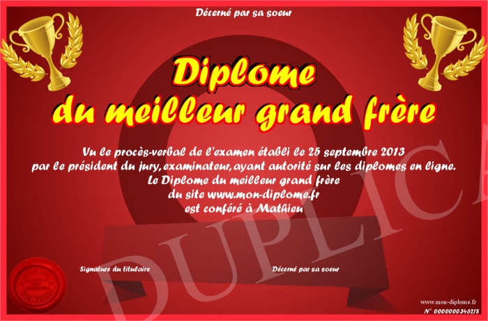 Envoyez par email votre Diplôme du meilleur grand frère personalisé