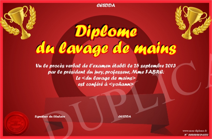 Envoyez par email votre Diplôme du lavage de mains personalisé