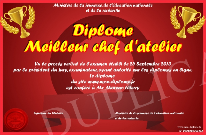 Envoyez par email votre Diplôme Meilleur chef d'atelier personalisé