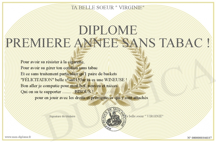 Envoyez par email votre Diplôme première année sans tabac ! personalisé