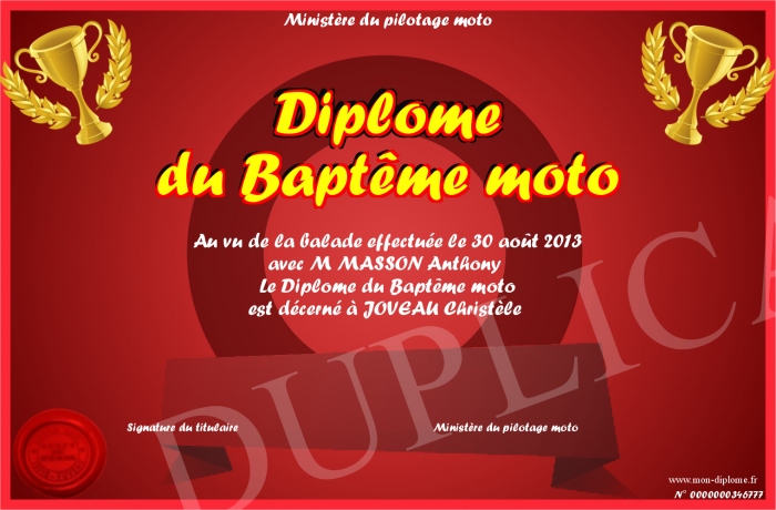 Envoyez par email votre Diplôme du Baptême moto personalisé