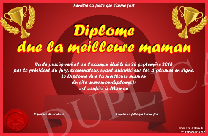Envoyez par email votre Diplôme due la meilleure maman personalisé
