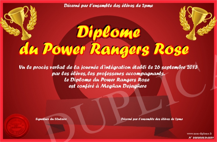 Envoyez par email votre Diplôme du Power Rangers Rose personalisé