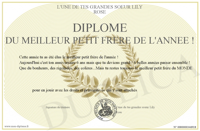 Envoyez par email votre Diplôme du meilleur petit frère de l'année ! personalisé