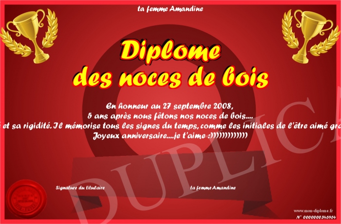 Envoyez par email votre Diplôme des noces de bois personalisé