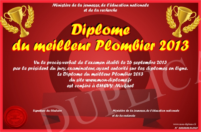 Envoyez par email votre Diplôme du meilleur Plombier 2013 personalisé