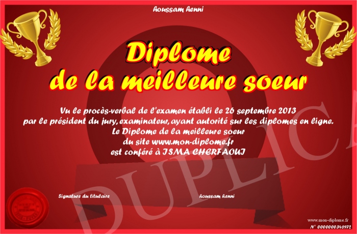 Envoyez par email votre Diplôme de la meilleure soeur personalisé