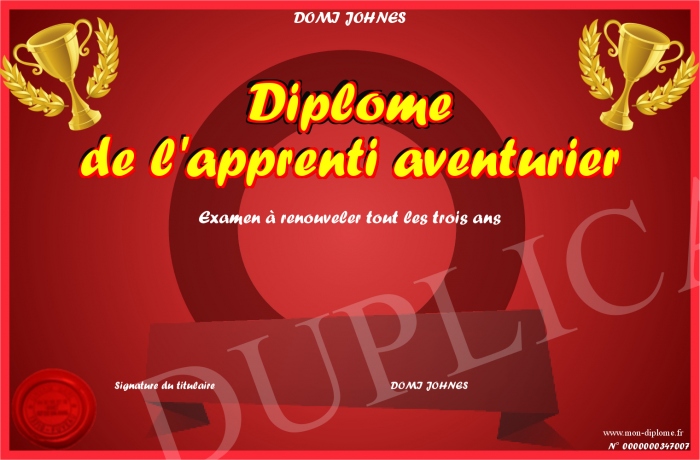 Envoyez par email votre Diplôme de l'apprenti aventurier personalisé