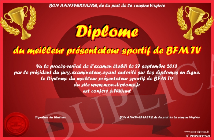 Envoyez par email votre Diplôme du meilleur présentateur sportif de BFM TV personalisé