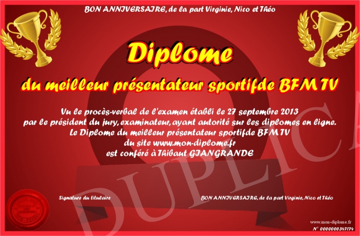 Envoyez par email votre Diplôme du meilleur présentateur sportifde BFM TV personalisé