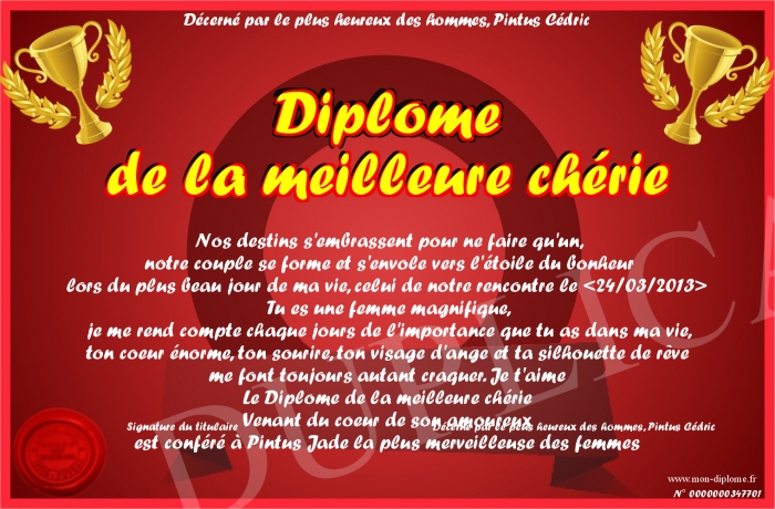 Envoyez par email votre Diplôme de la meilleure chérie personalisé
