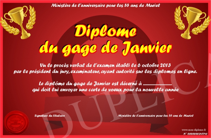 Envoyez par email votre Diplôme du gage de Janvier personalisé