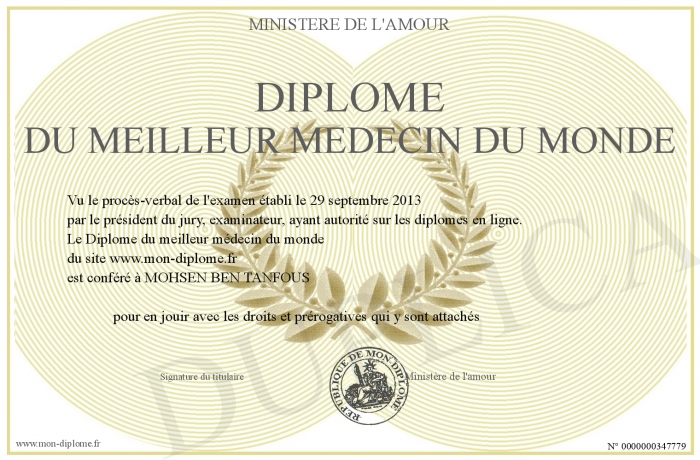 Envoyez par email votre Diplôme du meilleur médecin du monde personalisé