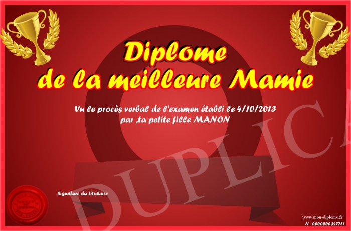 Envoyez par email votre Diplome de la meilleure Mamie personalisé
