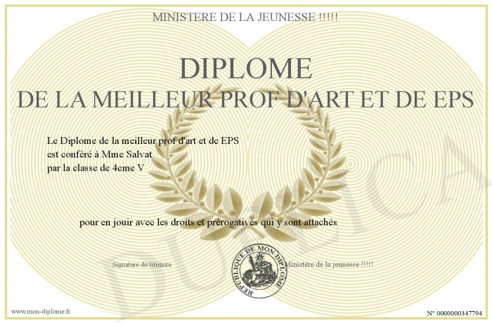 Envoyez par email votre Diplôme de la meilleur prof d'art et de EPS personalisé