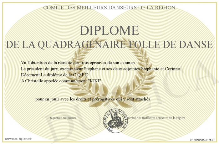 Envoyez par email votre Diplôme de la quadragénaire folle de danse personalisé